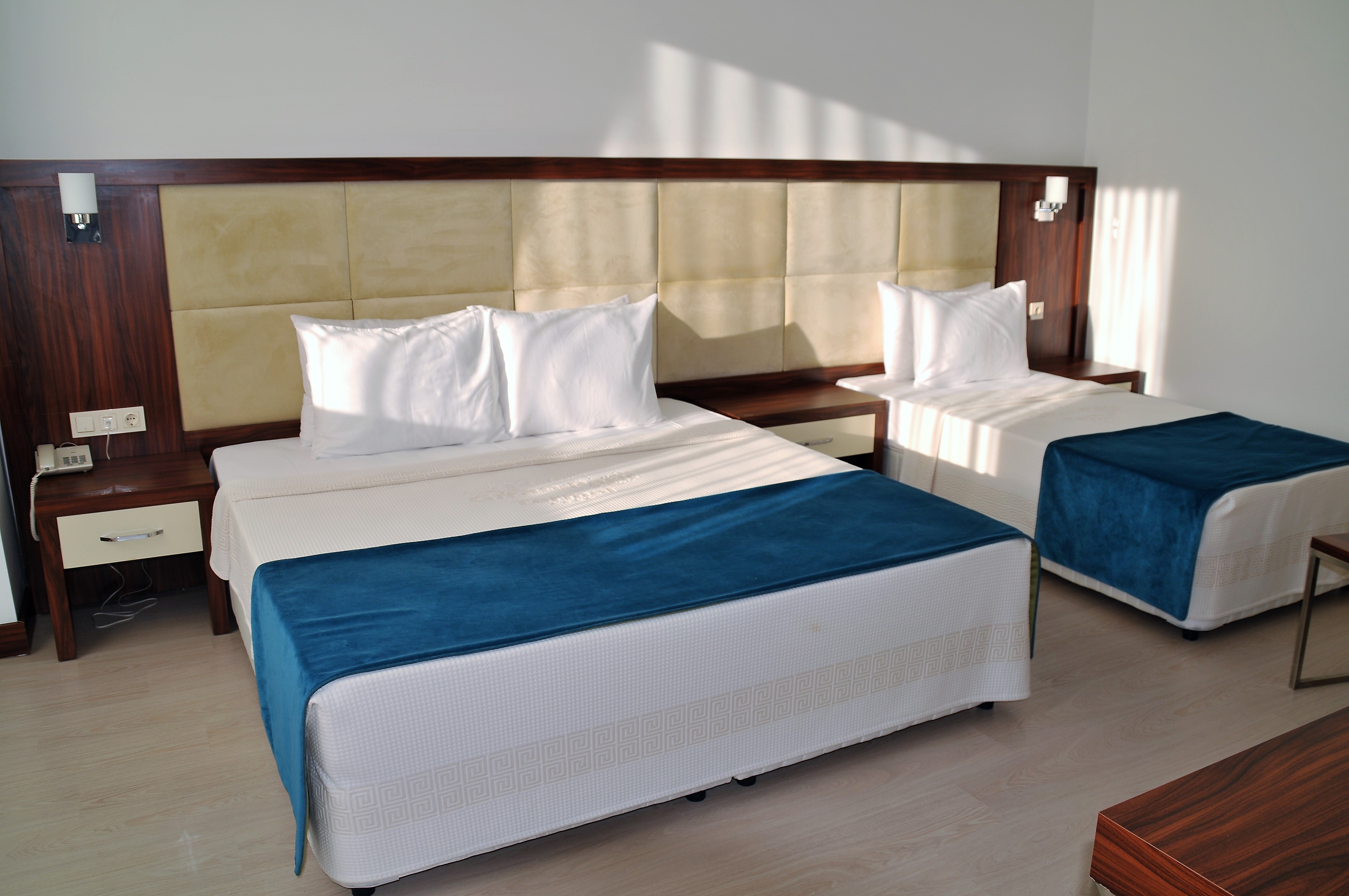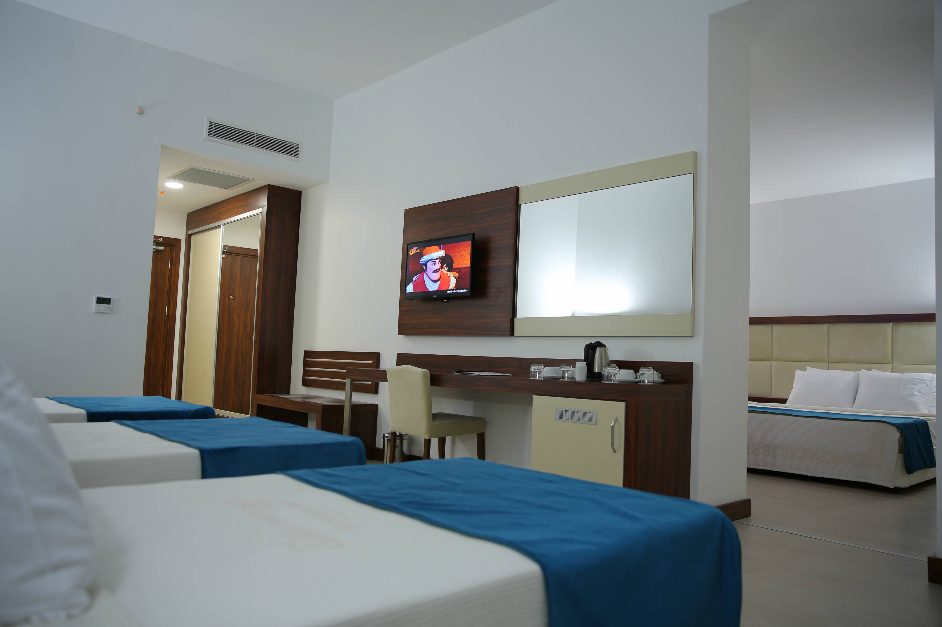 5 Kişilik Aile Odası: Sigara İçilmez, Duşakabin WC, Minibar, LCD TV, Uydu Yayını, Oda Servisi, Safe Box, Klima, Saç Kurutma ile hizmetinizde.